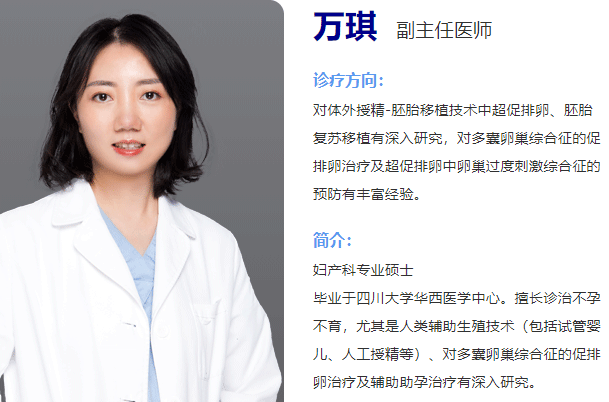 万琪,成都西囡医院副主任医师,妇产科专业硕士。毕业于四川大学华西医学中心。诊疗方向是对体外授精-胚胎移植技术中超促排卵、胚胎复苏移植有深入研究,对多囊卵巢综合征的促排卵。对多囊卵巢综合征的促排卵治疗及辅助助孕治疗有深入研究。对辅助生殖技术的临床及手术操作、治疗及超促排卵中卵巢过度刺激综合征的预防有丰富经验。
